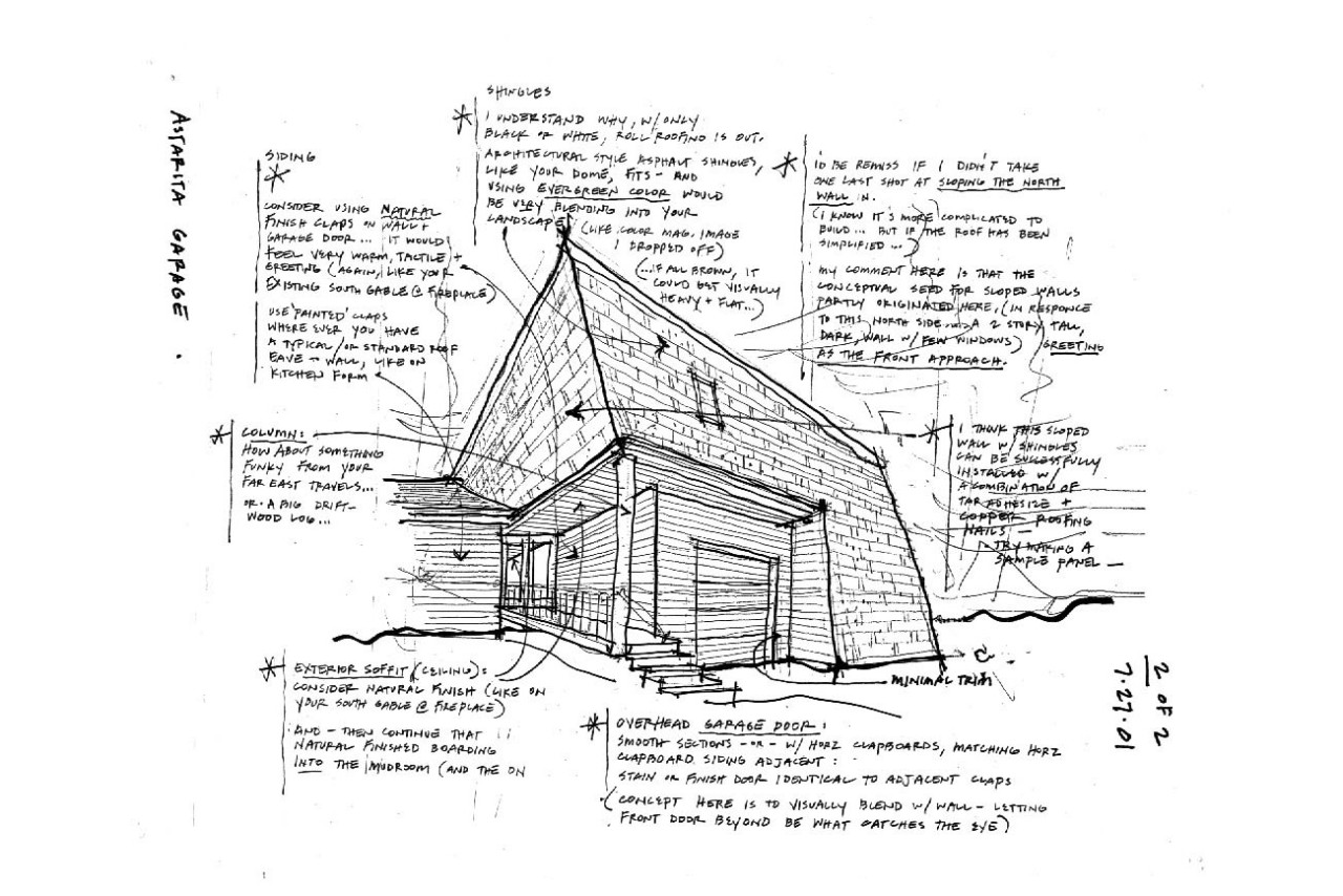 Domes, by their nature, break the conventional rules of what is a wall and what is a roof; the same system rolls from vertical to low slope and is surfaced entirely with asphalt shingles. With the rules already broken, we massed the garage as an ambivalent shape regarding what might be understood as walls vs roofs (the walls 'batter', leaning either inward or outward), and are covered by asphalt shingles (roofing). The roof has no traditional trim, just folds down to the 'battered' walls.